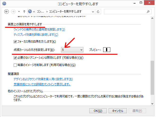 (5)「画面上の項目を見やすくします」 の「点滅カーソルの太さを設定します」で、デフォルトだと「1」です。この数字を大きくします。3~5だとけっこう見やすくなります。