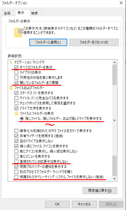 このような事情ですので、ファイルやフォルダはすべて表示する設定にすることをおすすめします。(なお、大げさに書きましたが非表示のままでもだいじょうぶです)